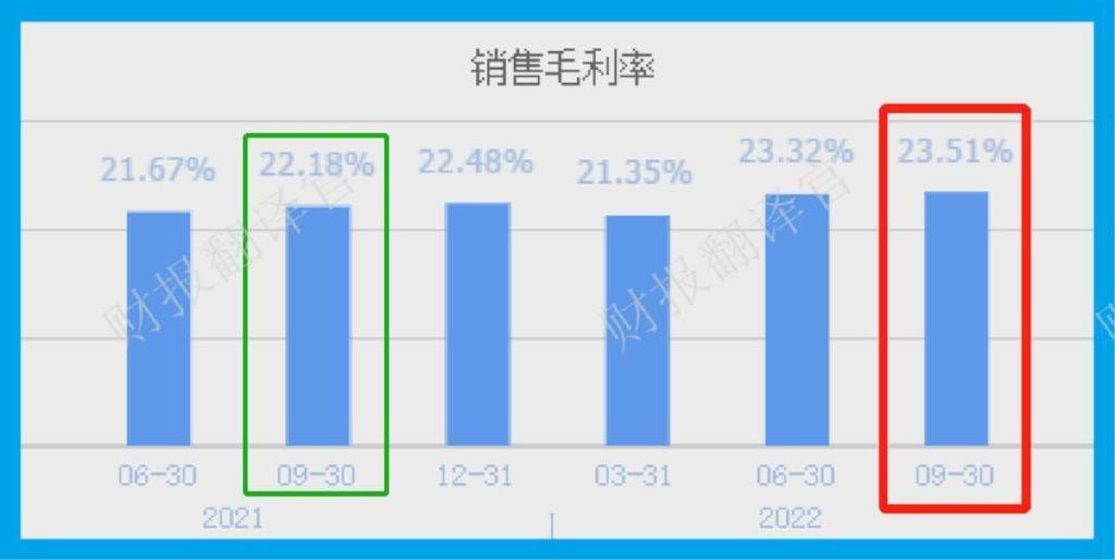 而到了2022年第三季度,这家公司同样销售100元的汽车零部件,却能赚回23.51元的毛利润,销售毛利率达到了23.51%,同比增长了6%。