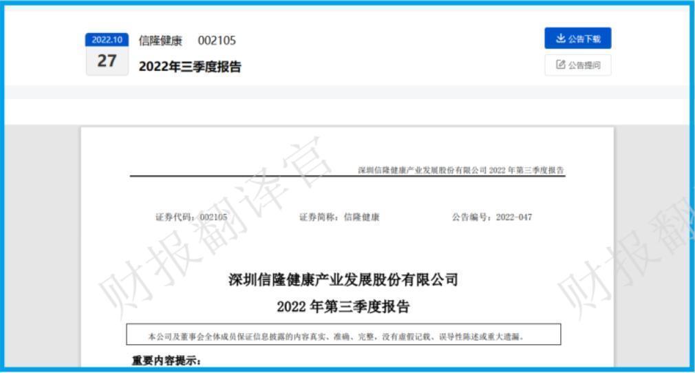 大家好我是财报翻译官,今天将调研A股汽车配件-摩托车概念板块中,信隆健康(股票代码:002105)这家上市公司2022年第三季度财报,下面进入今天的主题。