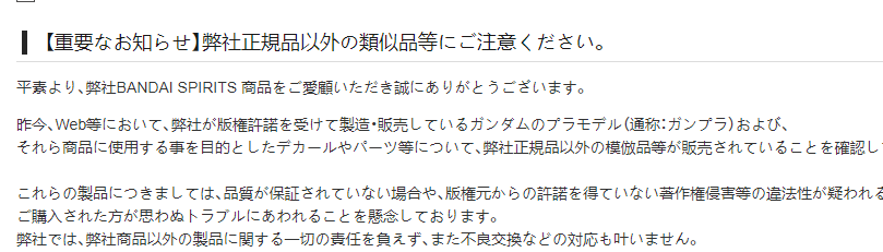 BANDAI SPIRITS官方日前发文,警告玩家目前市场上钢普拉仿制品投诉频发,特别是“标签”、“零件”等附属品假冒横行,玩家通过非正规渠道获得的假冒标签零件等没有官方售后服务。