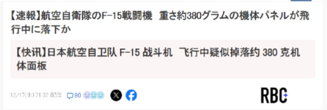 图:前几年F-15J飞掉的零件2020年,福冈县筑城基地的一架F-15J在起飞后不久,机身左侧发动机的整流罩脱落,零件坠入附近海域。2022年,同样是筑城基地的F-15J在训练时,发生机翼下方导弹挂架部件从机翼脱落的事故。