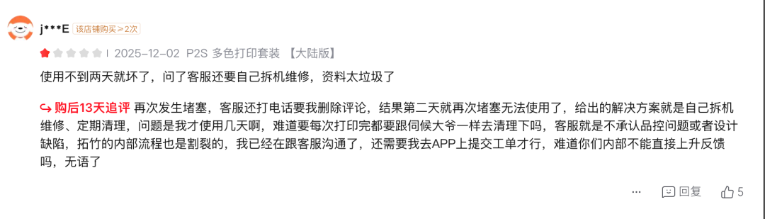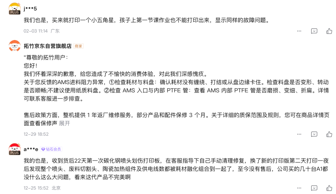 另有消费者评论称,拓竹官方曾向其表示:“如果设备配件出问题,即使原厂购买,到货第二天损坏也没有质保,需要消费者自行购买。”该消费者还反映,对于官方客服的专业素质并不满意,认为其对机器细节不熟悉,售后问题无法有效解决。
