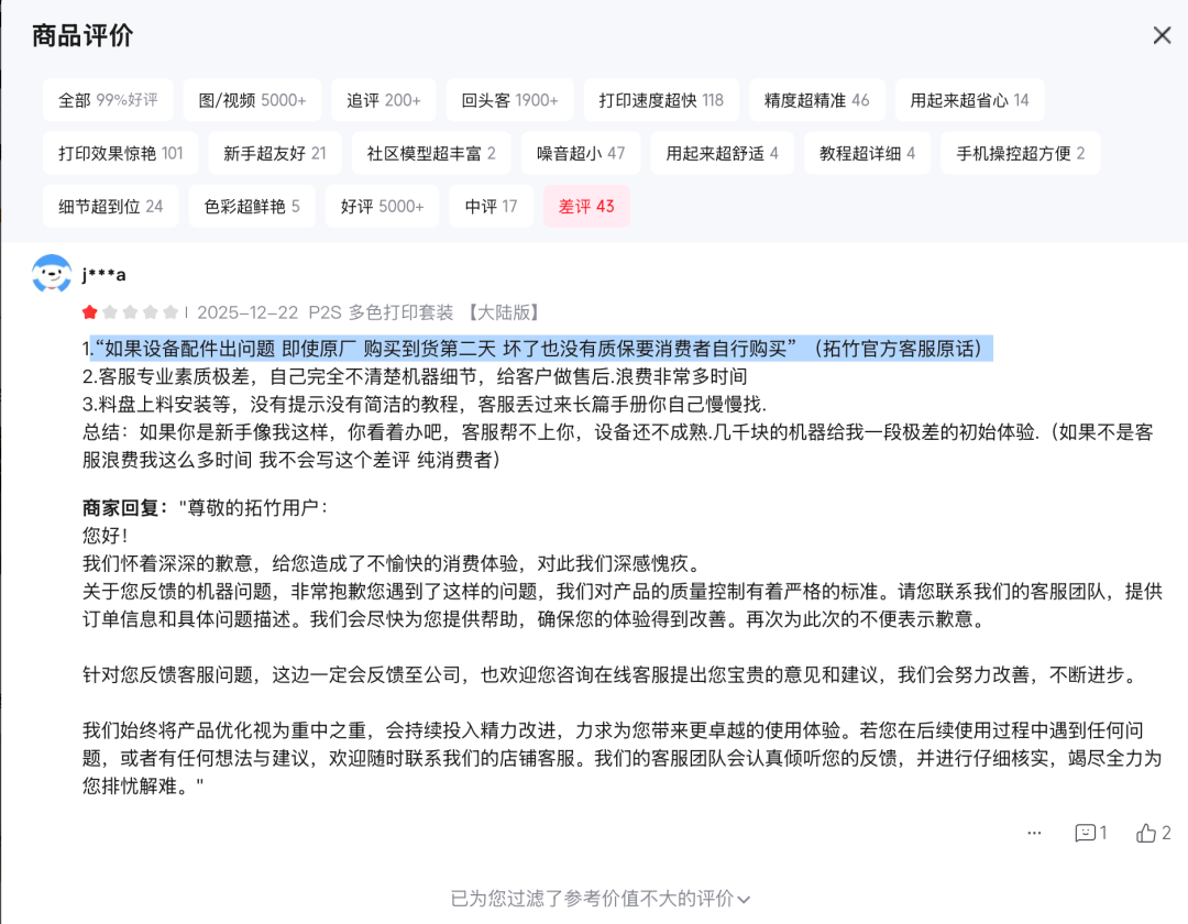 在拓竹官网,泰山财经注意到拓竹对于郭先生所购买的P2S产品描述为“生产力唾手可得”,在某购物平台累计已有2万条以上的评论,其中有消费者评论称此代产品“故障率极高,而且官方也不提供维修,都要自己动手修”。并且存在卡料、划伤打印板等问题。